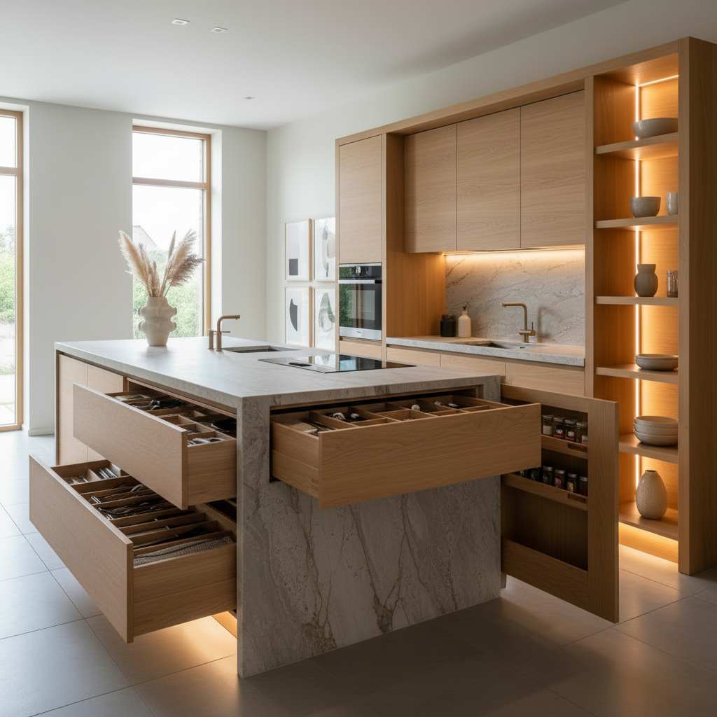 • Rangements adaptés : Pensez à des tiroirs spécialisés pour les ustensiles, les épices ou encore les recyclables.